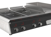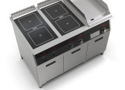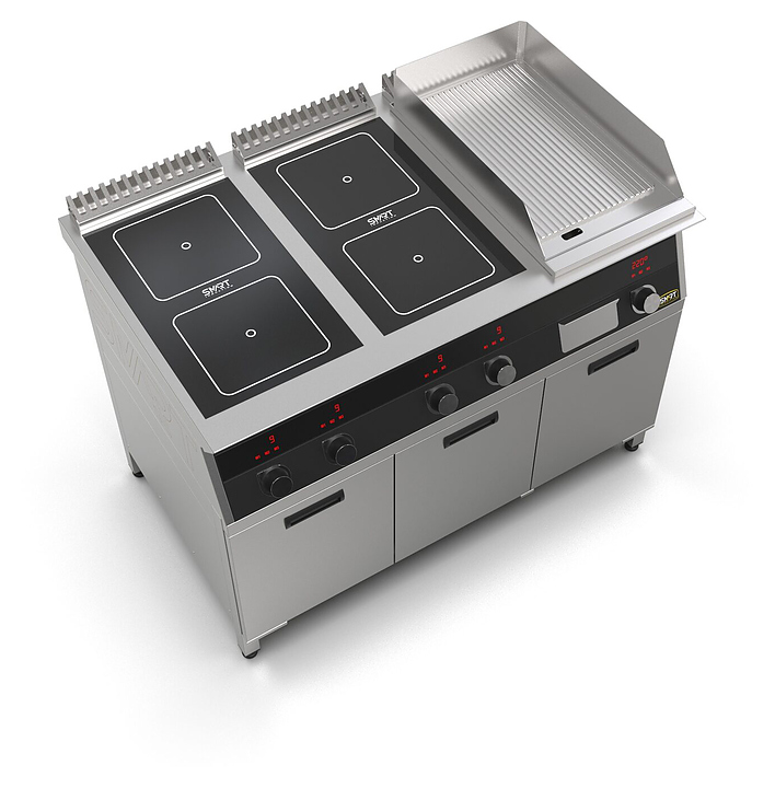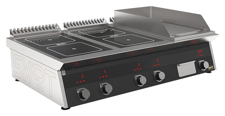 Комбинированная индукционная плита SMART INDUCTION K96-3KRB предназначена для приготовления и быстрого разогрева блюд на предприятиях общественного питания и торговли. Модель оснащена электронно-механической панелью управления с цифровой индикацией и сенсорными кнопками, 3 съемными жировыми фильтрами для отделения жира и влаги от поступающего внутрь аппарата воздуха, 2 ящиками для сбора жира и регулируемыми по высоте ножками. Корпус и столешница выполнены из нержавеющей стали AISI430, рабочая поверхность плиты - из стеклокерамики, рабочая поверхность гриля - из нержавеющей стали, передняя панель имеет стойкое полимерное покрытие черного цвета.