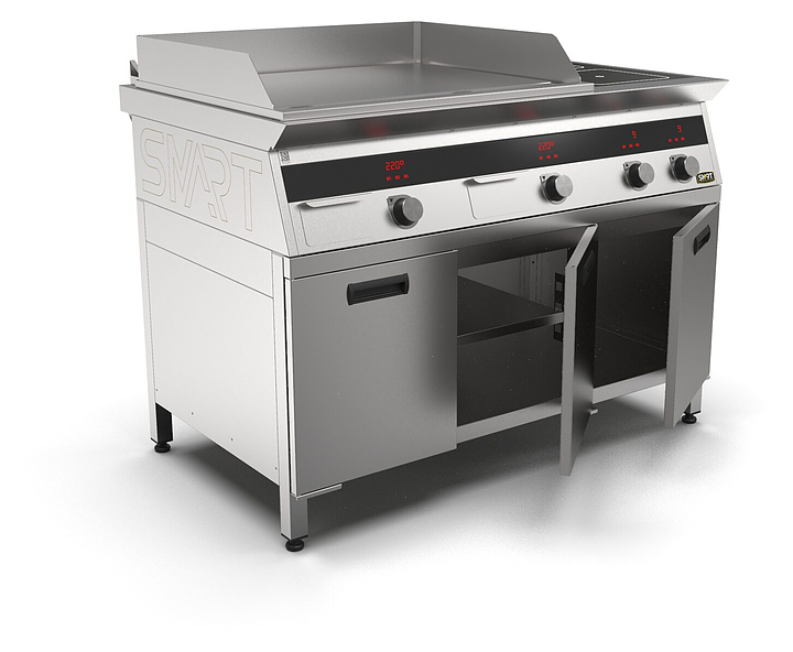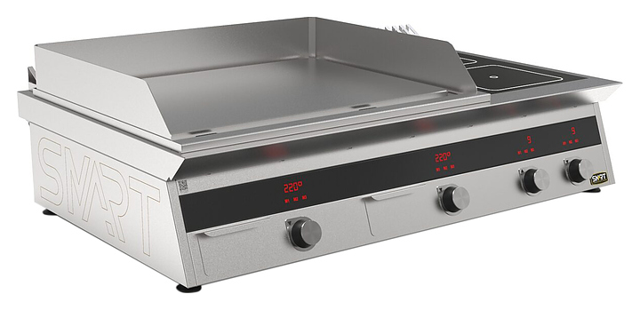 Комбинированная индукционная плита SMART INDUCTION K96-3PPKN предназначена для приготовления и быстрого разогрева блюд на предприятиях общественного питания и торговли. Модель оснащена электронно-механической панелью управления с цифровой индикацией и сенсорными кнопками, 3 съемными жировыми фильтрами для отделения жира и влаги от поступающего внутрь аппарата воздуха, 2 ящиками для сбора жира и регулируемыми по высоте ножками. Корпус и столешница выполнены из нержавеющей стали AISI430, рабочая поверхность плиты - из стеклокерамики, рабочая поверхность гриля и передняя панель - из нержавеющей стали.