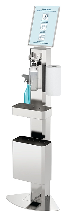 Бесконтактная станция Chilz REN R05 предназначена для дезинфекции рук на предприятиях общественного питания и торговли, в офисах, образовательных и медицинских учреждениях, а также в других местах общественного пользования. Модель оснащена ножной педалью для подачи антисептика, контейнером для масок и перчаток, корзиной для мусора, держателем спрея и бумажных полотенец и информационной панелью. Основа и аксессуары за исключением информационной панели выполнены из нержавеющей стали.