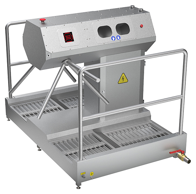 Модуль гигиены Азимут ДМГ-001 предназначен для очистки и дезинфекционной обработки кистей рук и подошв обуви на входе и контроле выхода чистых помещений в производственных цехах. Изделие выполнено из нержавеющей стали AISI304.