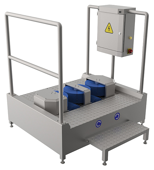 Санпропускник Азимут БМГ-004 предназначен для автоматической чистки и дезинфекции подошв и голенищ обуви на входе и выходе в чистые помещения в производственных цехах. Модель оснащена программируемым контроллером, форсунками и системой поднятия решеток. Корпус выполнен из нержавеющей стали AISI304.
