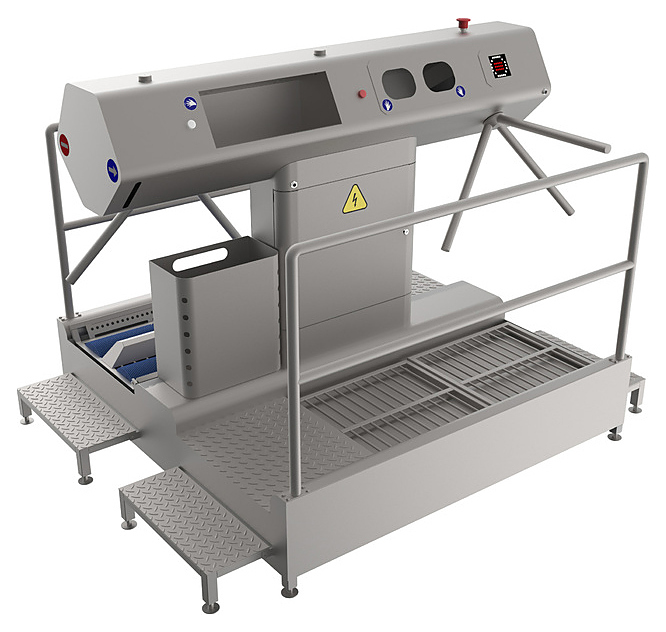Санпропускник Азимут ДМГ-004 предназначен для очистки и дезинфекционной обработки кистей рук и подошв обуви на входе и контроле выхода чистых помещений в производственных цехах. Модель оснащена светодиодным дисплеем, 4 форсунками в моющей камере и программируемой электронной системой с эффективным контроллером. Изделие выполнено из нержавеющей стали AISI304.