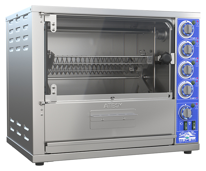 Гриль-шашлычница ATESY ЧЕГЕТ ГШК-4.3-02 используется на предприятиях общественного питания и торговли для приготовления шашлыков из мяса, птицы, рыбы, морепродуктов и овощей. Модель оснащена терморегулятором, расположенным на передней панели и позволяющим плавно регулировать интенсивность нагрева. Корпус выполнен из пищевой нержавеющей стали AISI 430, садки - из нержавеющего прутка.