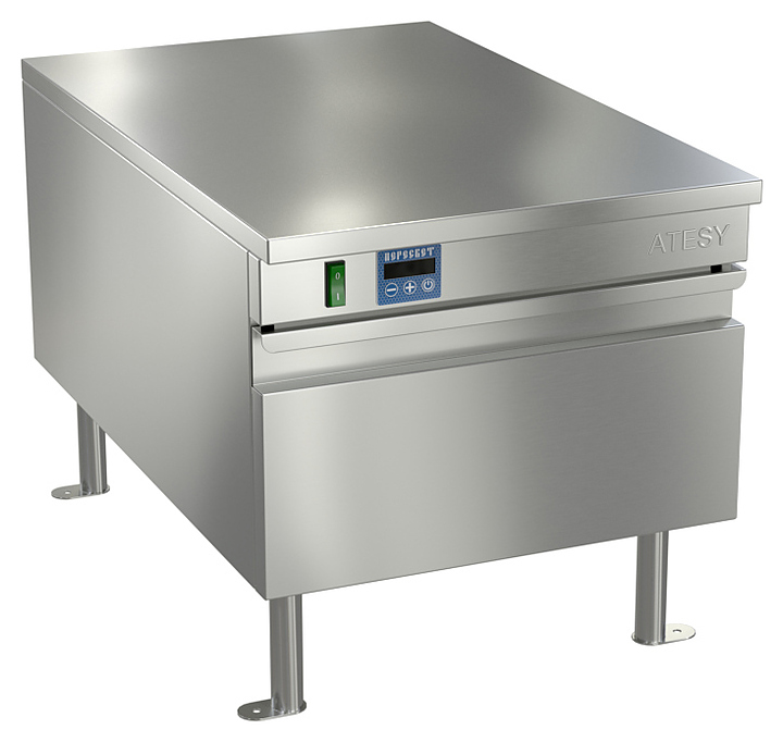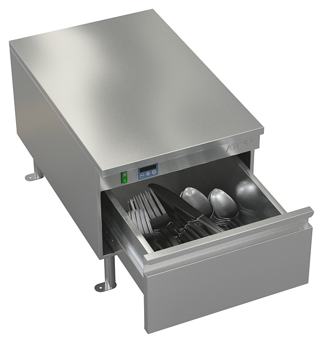 Стерилизатор ATESY ССПИ-1.1-02-Н используется на предприятиях общественного питания и торговли для обеззараживания столовых приборов и кухонного инвентаря. Модель оснащена электронной панелью управления, расположенной на фасадной части. Все конструктивные элементы выполнены из полированной нержавеющей стали AISI 430.
