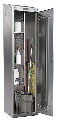 Шкаф KAYMAN ШДИ-400-2 А используется на предприятиях общественного питания и торговли, а также в других заведениях общественного пользования для хранения, сушки и дезинфекции уборочного инвентаря. Модель оснащена модулем сушки и дезинфекции в основании: 2 трубчатыми электронагревателями (ТЭНами), вентилятором и бактерицидной ультрафиолетовой лампой, крючками для инвентаря на правой боковине, угловой полкой для моющих средств и перчаток слева, 2 разделительными полками снизу, распашной дверью и электромеханической панелью управления с 2 поворотными переключателями. Корпус и все конструктивные элементы выполнены из нержавеющей стали марки AISI 430, карман – из оргстекла.
