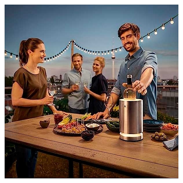 Кулер WMF Ambient 04.1540.0011предназначен для поддержания заданной температуры бутылок вина в рамках одного температурного режима в ресторанах, специализированных магазинах, у буфета, барной стойки или стойки для продажи спиртных напитков, в отелях, в частных домах или квартирах. Модель оснащена декоративной светодиодной подсветкой вверху и внизу с 3 уровнями яркости, которая легко регулируется с помощью касания. Кулер также можно использовать как ведерко для льда. Охлаждающую манжету можно хранить в горизонтальном положении в отсеке для льда.