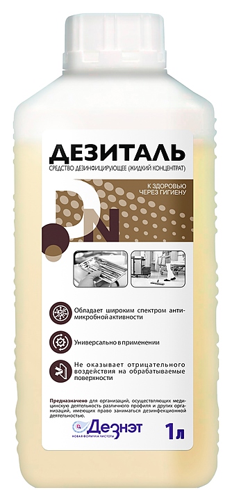 Дезинфицирующее средство Дезнэт Дезиталь, 1 л используется в медицинских организациях различного профиля, аптеках, в образовательных учреждениях, на предприятиях общественного питания и торговли, в учреждениях социального обеспечения, офисах и в быту для дезинфекции, санитарной и противоплесневой обработки различных поверхностей в помещениях, проведения генеральных уборок. Средство представляет собой концентрированную прозрачную бесцветную или окрашенную жидкость со слабым специфическим запахом. Поставляется во флаконе без дозатора.