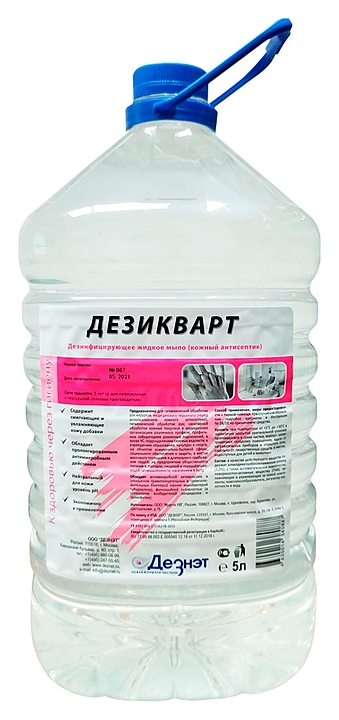 Антибактериальное жидкое мыло Дезнэт Дезикварт, ПЭТ-эконом, 5 л используется на предприятиях общественного питания и торговли, в медицинских и лечебно-профилактических организациях различного профиля, в учреждениях образования, социальной сферы, культуры, спорта и отдыха, производственных цехах, торговых центрах, салонах красоты и отелях для гигиенической и санитарной обработки кожных покровов. Средство представляет собой вязкую прозрачную или соответствующую цвету красителя жидкость со слабым специфическим запахом, обладает пролонгированным антимикробным действием. Поставляется в экономичной ПЭТ-упаковке без дозатора.