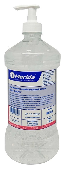 Дезинфицирующий гель Merida ЭКОБРИЗ MK013 используется для обработки и дезинфекции кожи рук, а также для гигиенической обработки поверхностей. Средство поставляется в пластиковой бутыли с дозатором.