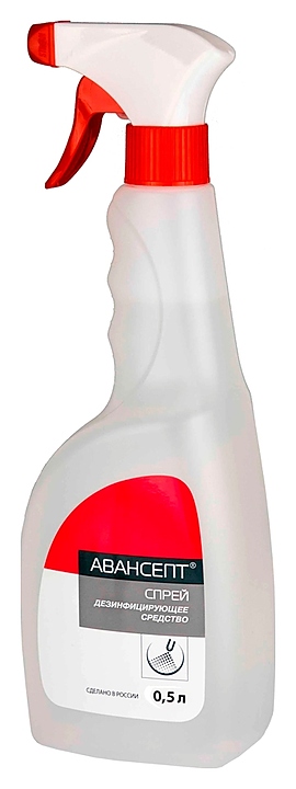 Дезинфицирующее средство Техноэкспорт Авансепт, спрей, 500 мл, используется в медицинских и лечебно-профилактических организациях различного профиля, на предприятиях общественного питания и торговли, в учреждениях социального обеспечения, образования, культуры, спорта и отдыха, в офисах, на объектах коммунально-бытовых служб, в быту для дезинфекции небольших по площади поверхностей в помещениях, в том числе поверхностей медицинских приборов и оборудования, резиновых и пластиковых ковриков, телефонных аппаратов, мониторов, компьютерных клавиатур, мышек. Средство представляет собой прозрачную жидкость от бесцветного до светло-желтого цвета со слабым характерным запахом спирта и применяемой отдушки. Поставляется в виде спрея-распылителя.