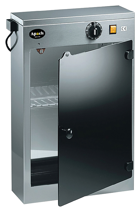 Стерилизатор для ножей Apach AUV16 используется на предприятиях общественного питания и торговли. Модель оснащена электромеханическим управлением, держателем, который позволяет обеззараживать ножи с двух сторон без необходимости их поворачивать. Корпус выполнен из нержавеющей стали AISI 430, дверца и держатель ножей - из плексигласа.