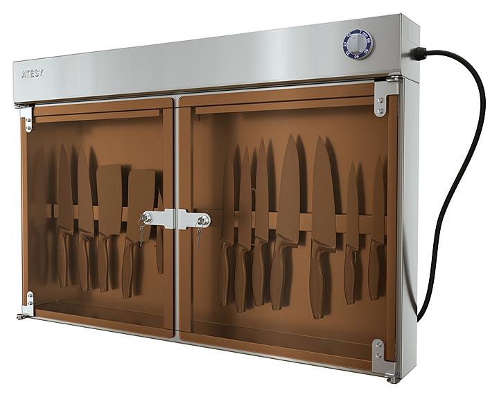 Стерилизатор ATESY СТУ-2-36-02 предназначен для обеззараживания ножей и других инструментов на предприятиях общественного питания и торговли. Модель оснащена бактерицидными лампами низкого давления, таймером с 0 до 60 мин. и замком для сохранности ножей. Корпус выполнен из нержавеющей стали AISI430, дверь - из тонированного стекла, держатель - из нержавеющей стали, колба - из увиолевого стекла.
