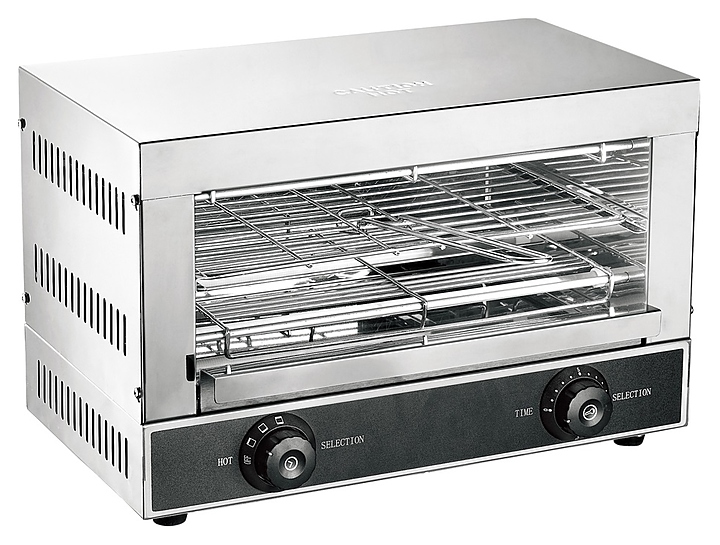 Тостер VIATTO VA-TS-01 предназначен для подогрева и поджарки кусочков хлеба в кафе, ресторанах и на предприятиях общественного питания и торговли. Модель оснащена кварцевыми нагревательными трубками с защитными решетками и механической панелью управления. Корпус выполнен из нержавеющей стали, решетка – из железа с никелированным покрытием.