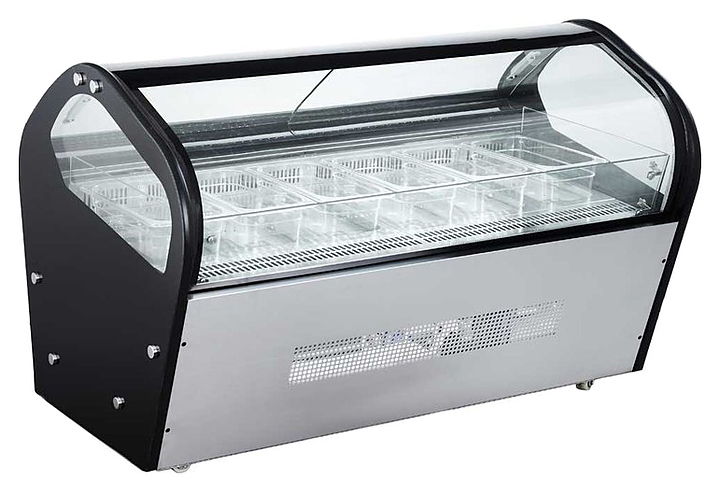 Витрина для мороженого Enigma RTD-122L используется на предприятиях общественного питания и торговли для демонстрации и хранения мороженого, сорбета и йогурта-мороженого. Модель оснащена электронным управлением и раздвижными дверьми-купе со стороны оператора. Внутренний короб и лотки выполнены из поликарбоната, боковины выкрашены в черный цвет.