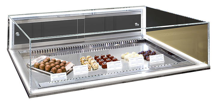 Встраиваемая витрина Finist GLASSIER Gс-15/55/2.2 предназначена для кратковременного хранения и предпродажной демонстрации шоколада, конфет и прочих небольших кондитерских изделий на предприятиях общественного питания и торговли. Модель оснащена охлаждаемой камерой-накопителем, раздвижными дверьми-купе и светодиодной подсветкой. Витрина может монтироваться в столешницу из любого материала. Зона выкладки выполнена из высококачественной зеркальной нержавеющей стали, агрегатная часть - из оцинкованной стали, корпус - из просветленного стекла, позволяющего рассмотреть товар со всех сторон.