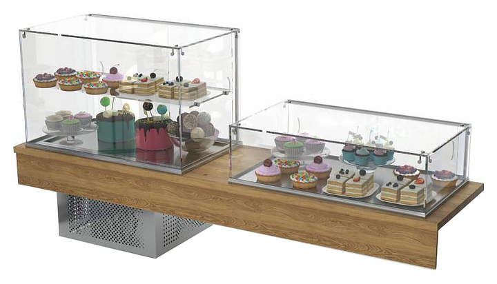 Комплект витринКАМИК ВХ-341900 серии 1100 используется на предприятиях общественного питания и торговли для охлаждения, демонстрации и кратковременного хранения продуктов и готовых блюд. Модель оснащена куполом и полкой. Корпус выполнен из нержавеющей стали AISI 430 толщиной 1 мм, столешница - из нержавеющей стали AISI 304 толщиной 1 мм, купол и полка - из каленого стекла толщиной 10 мм.