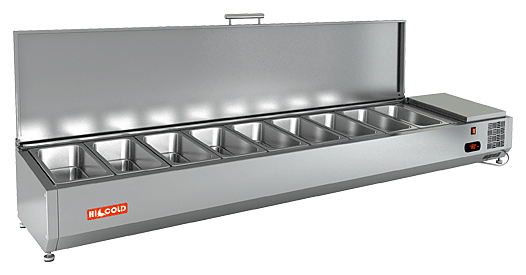 Настольная холодильная витрина HICOLD VRTU 1970 используется на предприятиях общественного питания и торговли для демонстрации, охлаждения и кратковременного хранения салатов, гарниров, закусок и других готовых блюд. Модель оснащена крышкой и специальным креплением для стола. Изделие выполнено из нержавеющей стали.