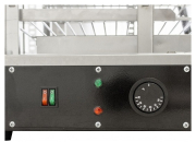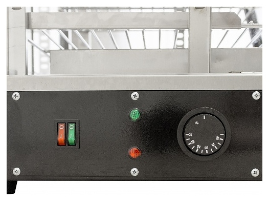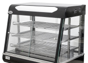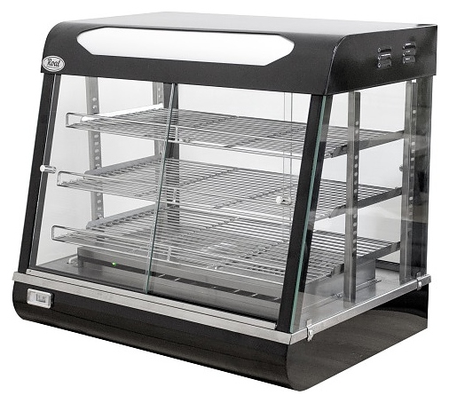 Настольная тепловая витрина ROAL SC-60-1 предназначена для демонстрации и хранения в горячем состоянии готовых блюд на предприятиях общественного питания и торговли. Модель оснащена обзорным остеклением с наклонным фронтом, 3 полками и электромеханической панелью управления. Корпус выполнен из окрашенного в черный цвет металла.