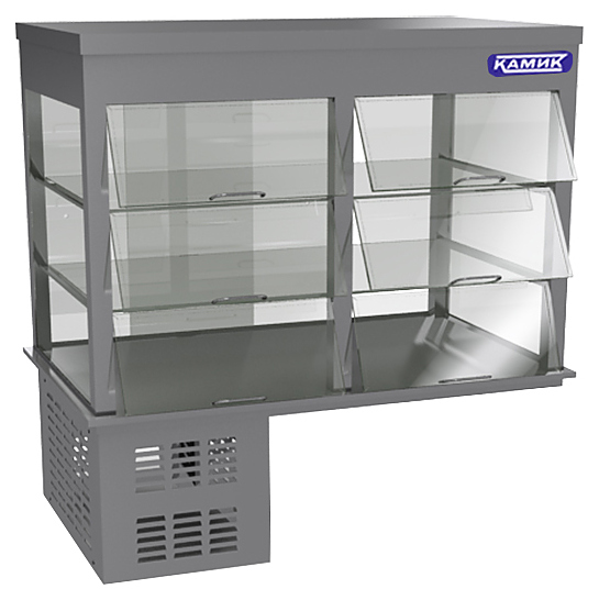 Встраиваемая витрина КАМИК ВХ-10664 используется на предприятиях общественного питания и торговли для охлаждения, демонстрации и кратковременного хранения продуктов и готовых блюд. В правой нижней части конструкции расположен холодильный агрегат. Корпус выполнен из нержавеющей стали AISI 430 и AISI 304, полки - из каленого стекла.