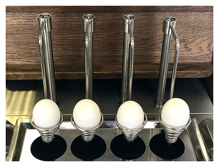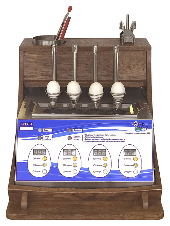 Яйцеварка ATESY ЯВА-4-01 используется на предприятиях общественного питания, торговли и гостиничного бизнеса для поштучного приготовления куриных яиц категории С0, С1 и С2 до выбранной степени готовности: всмятку, в мешочек, вкрутую в формате самообслуживания. Модель оснащена 4 механизмами с выдвижными штоками со съемными кронштейнами с корзинами - каждому механизму соответствует своя панель с необходимой программой приготовления. Все конструктивные элементы выполнены из легированной стали, декоративная полка-подставка - из натурального бука.