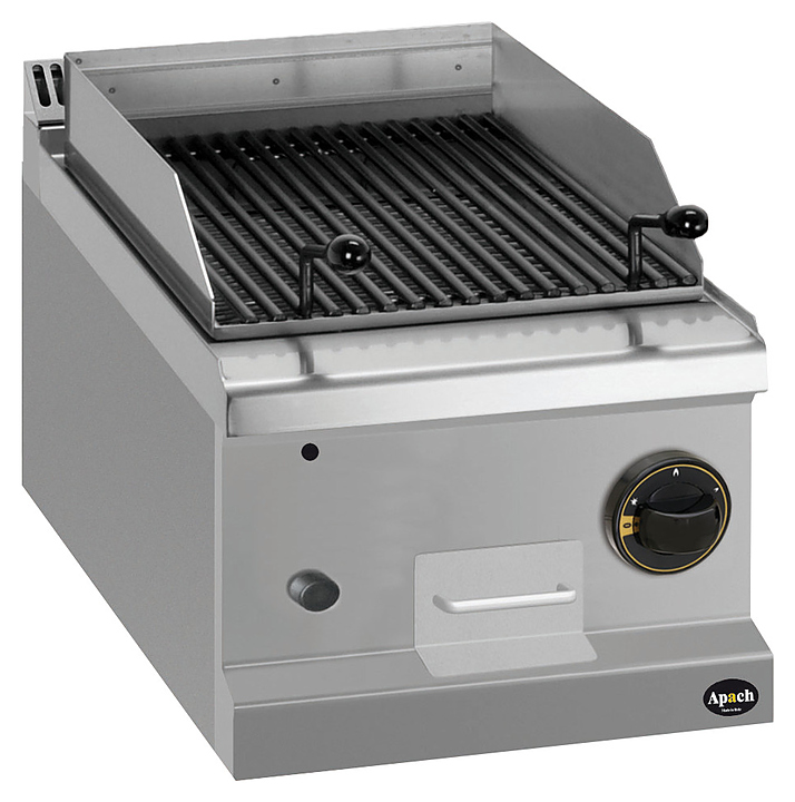 Лавовый гриль Apach APGG-47T предназначен для обжарки мяса, рыбы и овощей на предприятиях общественного питания и торговли. Модель с бортами оснащена горелкой с пьезоэлектрическим поджигом и системой стабилизации пламени и съемным лотком для сбора остатков пищи, масла и жира. Корпус, рабочая поверхность, панель управления и вытяжная решетка выполнены из нержавеющей стали AISI 304, боковые и задняя панели - из нержавеющей стали AISI 430, горелка и лоток - из нержавеющей стали.